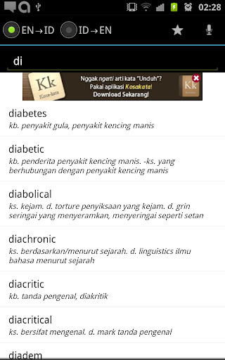 Katakan selamat tinggal dengan kamus lama anda. Anda tidak perlu membawa kamus yang berukuran besar dan berat dan anda juga tidak perlu bolak-balik halaman kamus anda. Tinggal download aplikasi ini di android, ketik kata yang ingin dicari, dan jreenggg.